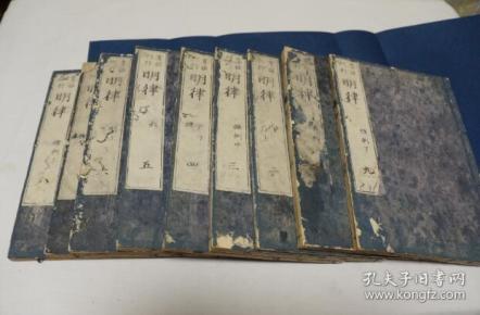 (5)《明律》大明律 线装9册全 和刻本 中国法制史上具有划时代意义的法典。它草创于金戈铁马的战争时期,完成于重典治国的洪武年代。这部大法不仅继承了明代以前中国古代法律文献的历史优点,是中国古代法律编纂的历史总结,而且下启清代乃至近代中国立法活动的发展,为中国近现代的法制建设提供了一些宝贵的借鉴。