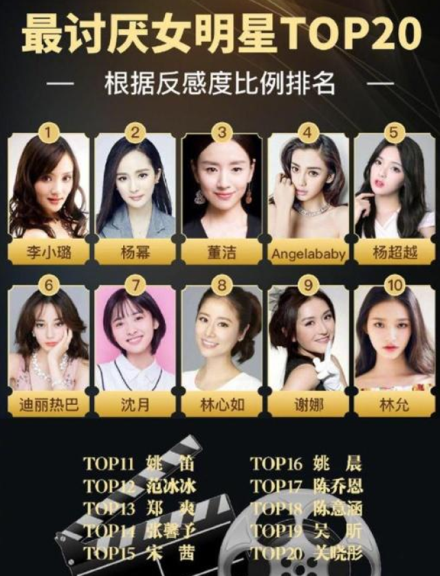 豆瓣票选最讨厌女明星TOP20,杨幂董洁进