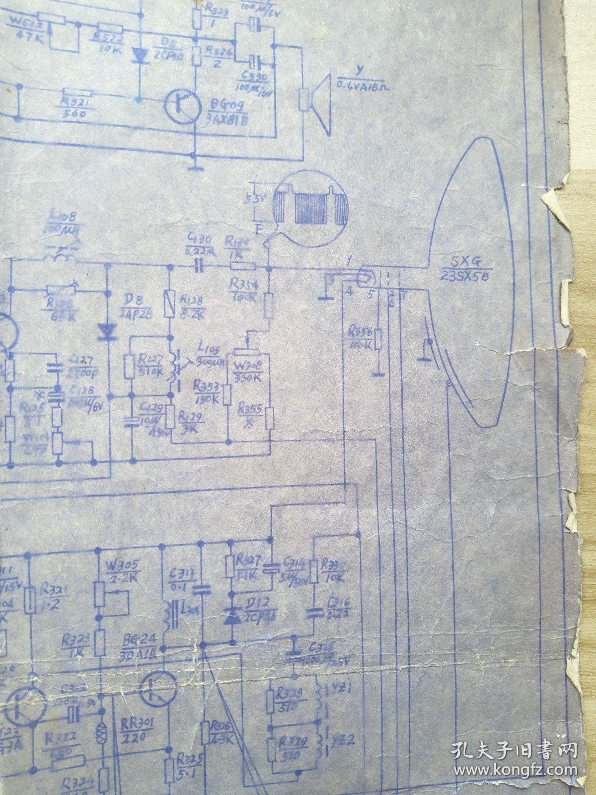 黑白电视机电路图一张,70年代蓝晒印(琴键的键字是二简字)。