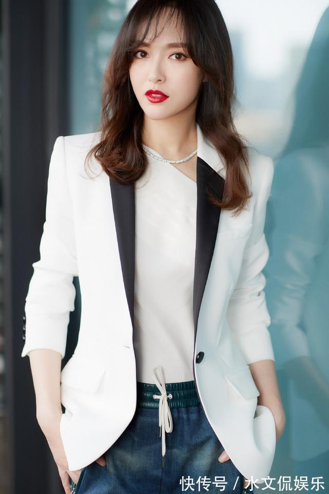 唐嫣胖了也很美,白西装搭牛仔裤优雅又