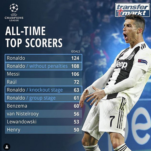 梅西、C罗领衔欧冠历史射手榜,劳尔、舍瓦