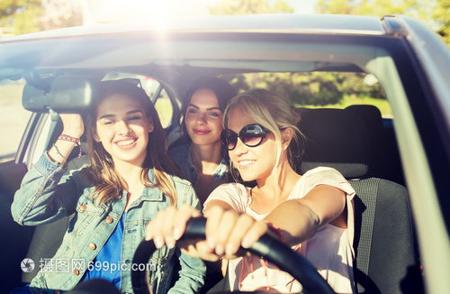 旅行人们的快乐的十几岁女孩轻妇女开车