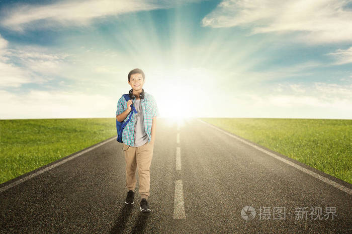 的男孩微笑着, 而在路上走在阳光下的背景