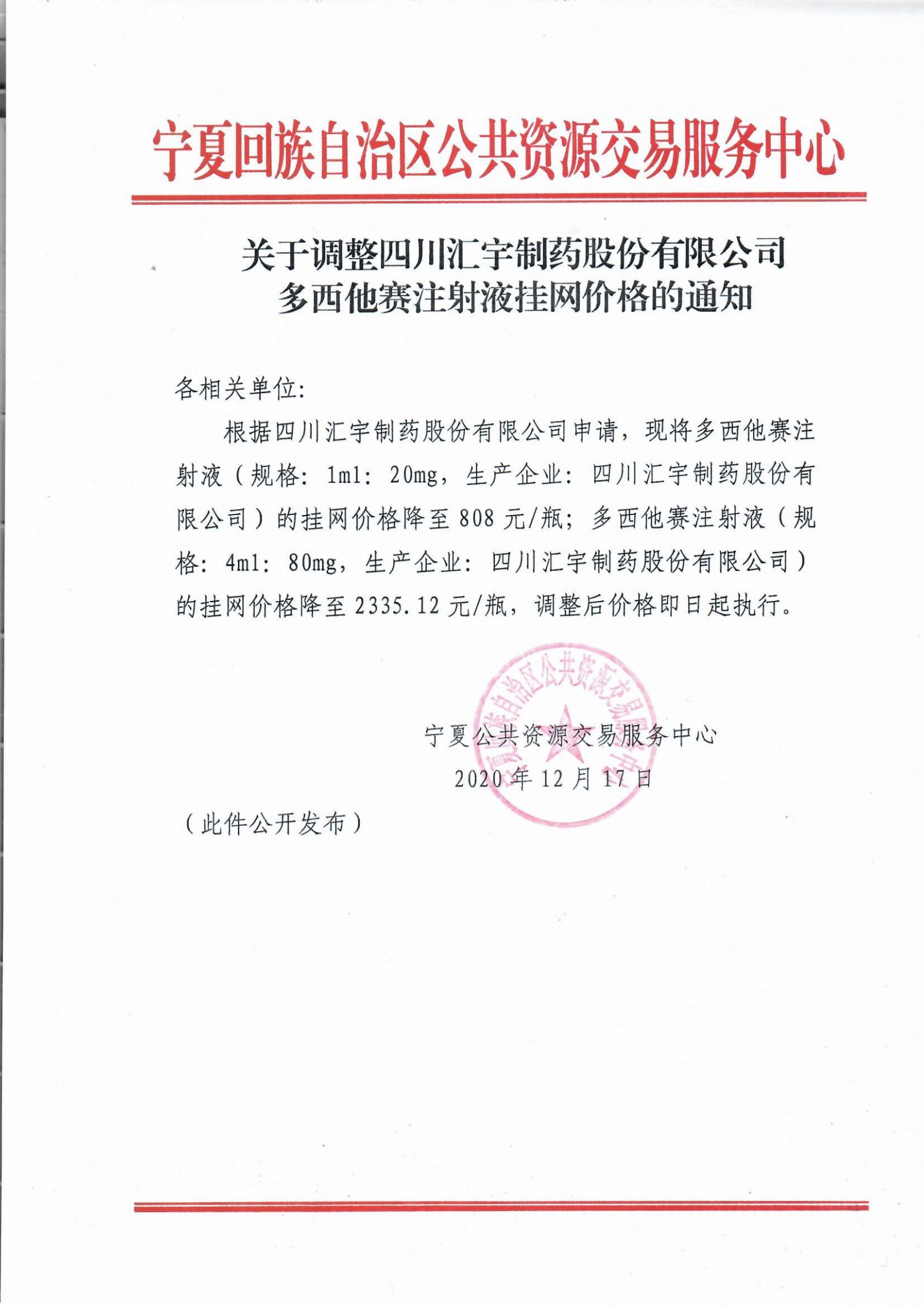 调整四川汇宇制药股份有限公司多西他赛