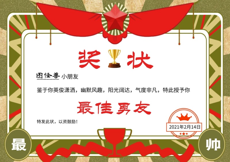 奖状情人节最佳男友搞笑证书