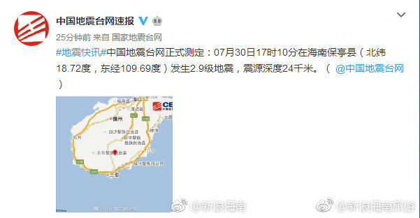 中国地震台网正式测定:海南保亭县发生2.9