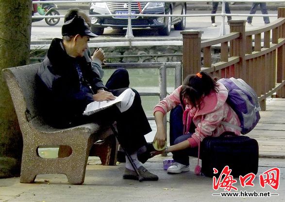海口街头擦鞋女实习生