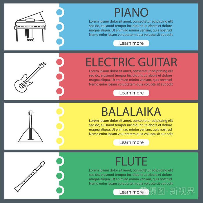 乐器网页横幅模板设置。钢琴, 电吉他,