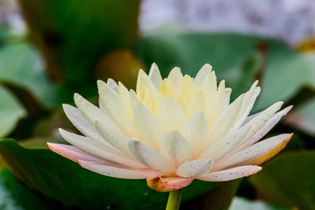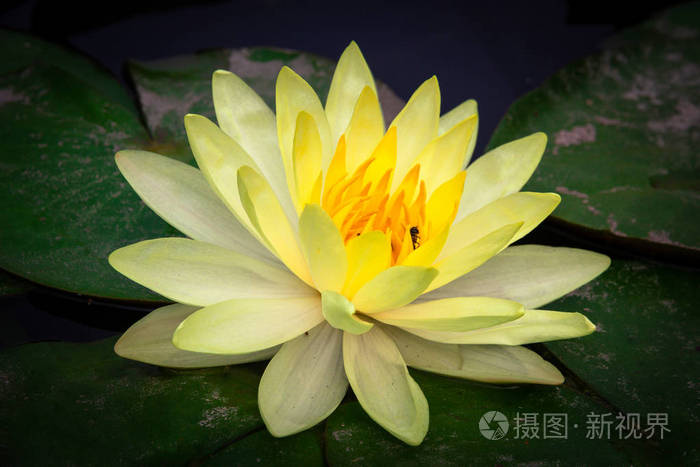 美丽盛开的黄莲花, 黄色的花粉和绿叶漂浮在池塘上