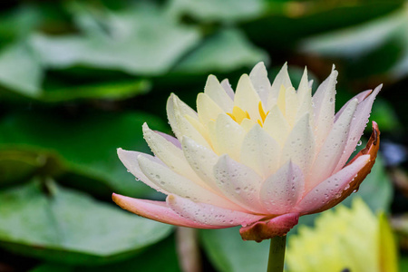 Brigth染黄莲花或荷花从油罐顶部角钢,自然