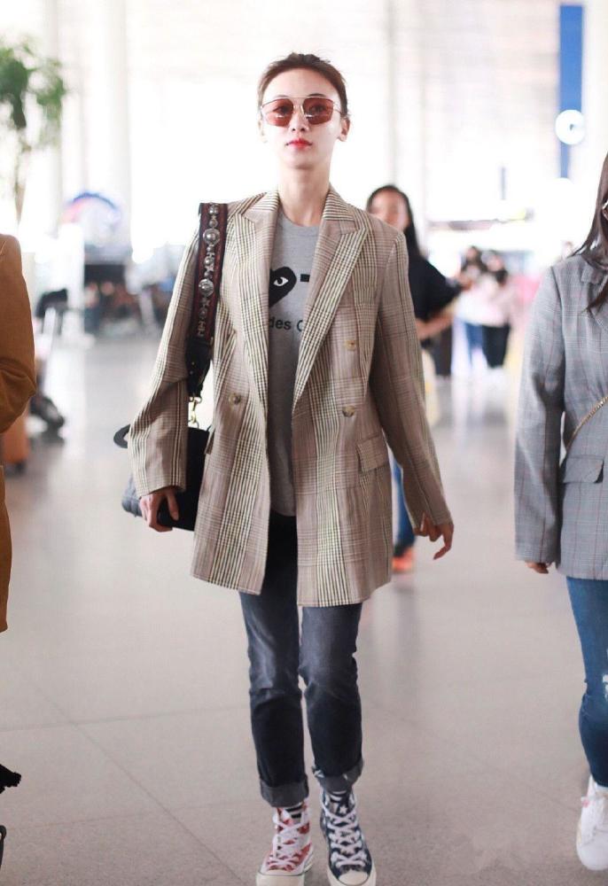 吴谨言瘦成纸片人,穿宽松西装牛仔裤,