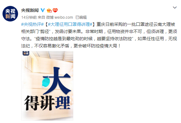 央视热评:大理征用口罩得讲理