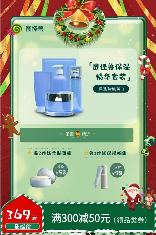 圣诞节绿色护肤品产品手绘风主图直通车海报