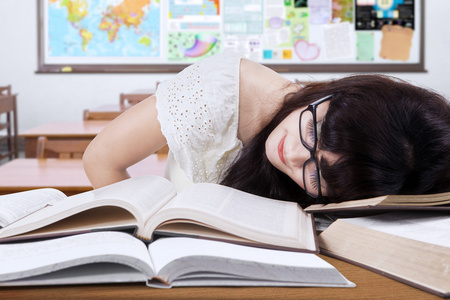 学生在学习中的类和睡眠在书上插画