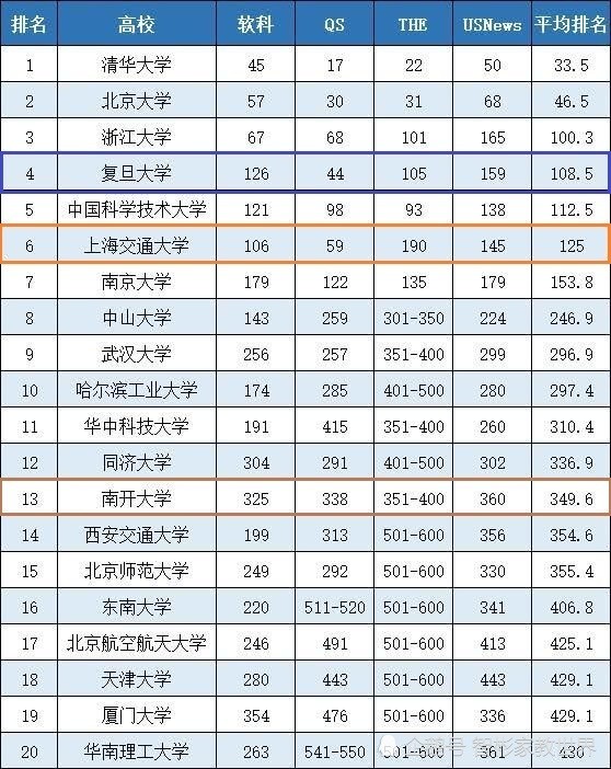 四大世界大学排行榜国内高校平均排名20强
