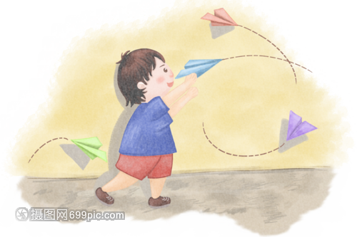 手绘放纸飞机的男孩