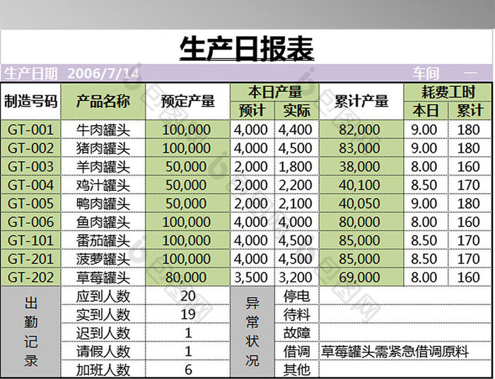 罐头商品生产日报表Excel模板