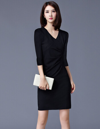 nasife素芬职业连衣裙新款OL中长款修身气质V领包臀长袖打底裙黑色七分袖M
