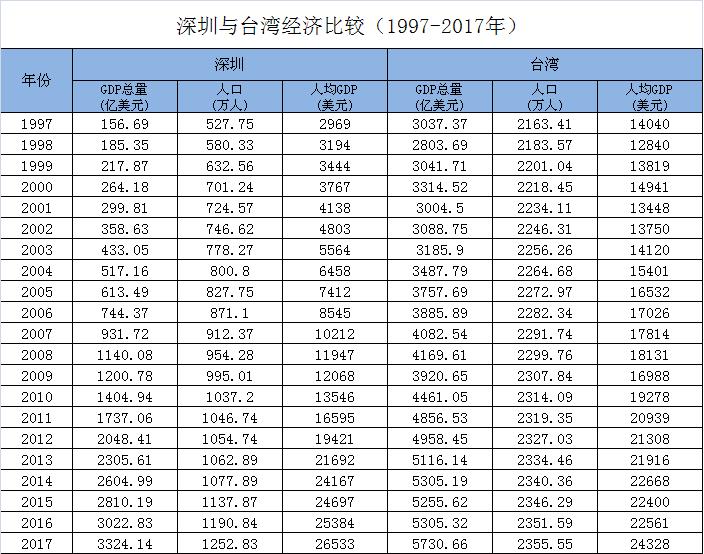深圳与台湾经济比较,看深圳人均GDP是