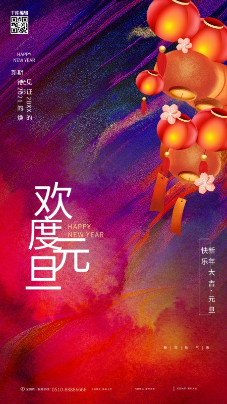 欢度元旦灯笼彩色水彩简约大气海报