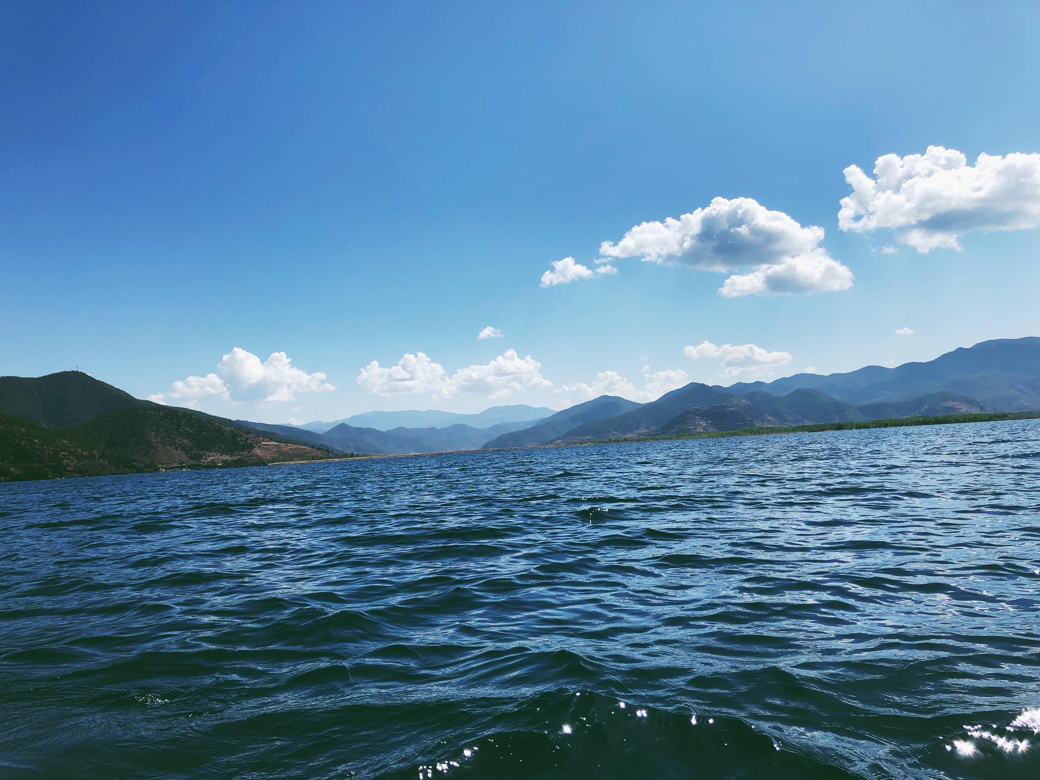 划船在泸沽湖湖面上,看着湛蓝的湖水