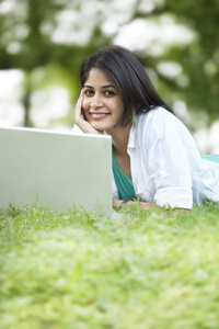 使用膝上型电脑在校园里的年轻女子