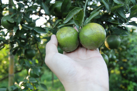 农夫拿着一个虫苹果在他的手, 挂在树枝上