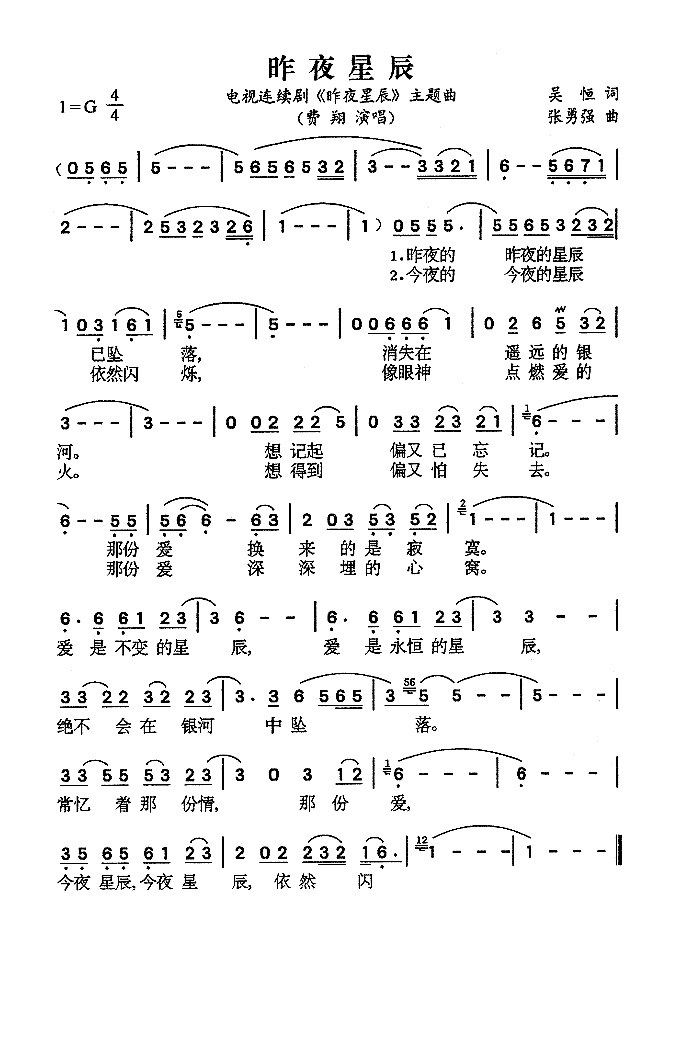 昨夜星辰(同名电视剧主题曲)简谱