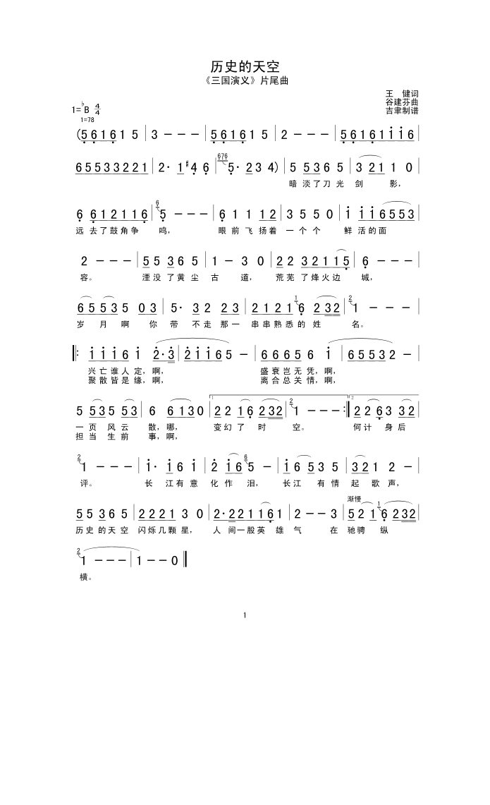 我想问一下谁有歌谱历史的天空这首老歌是