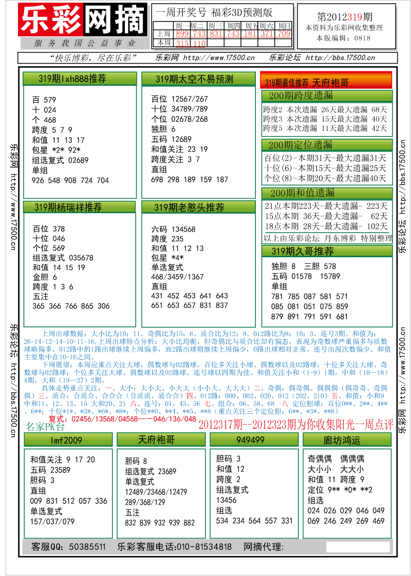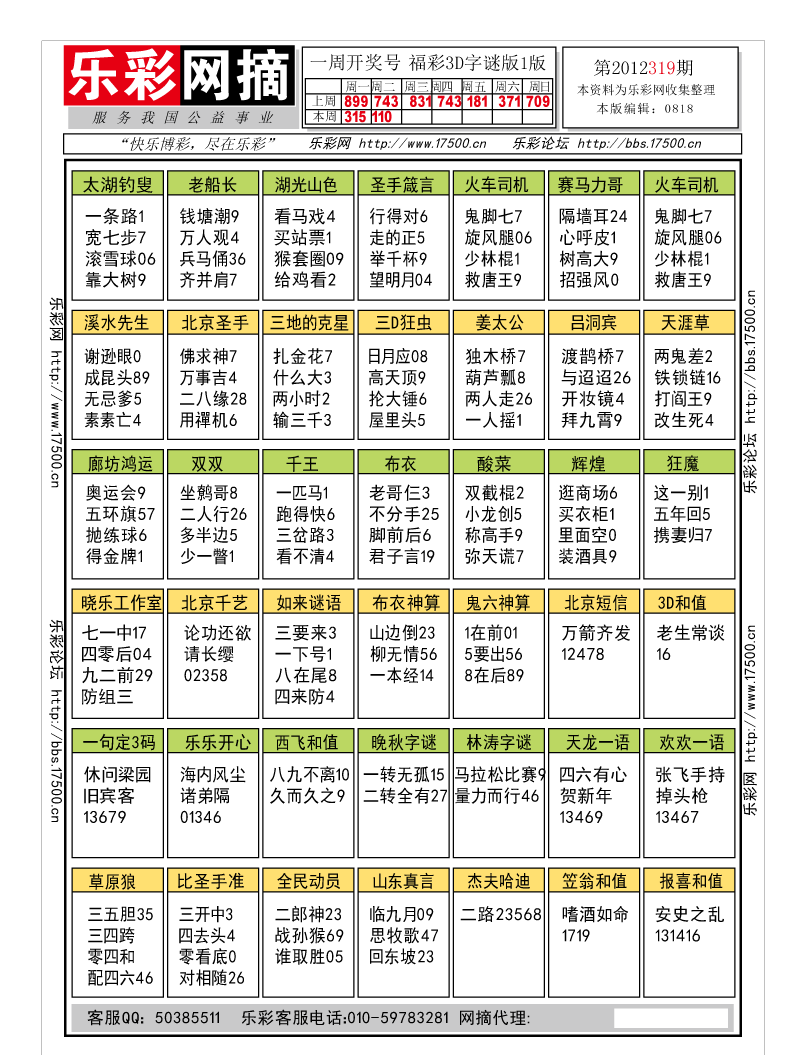 乐彩网摘福彩3D2012319期★字谜总汇★