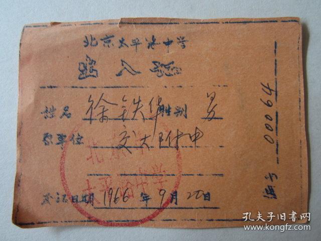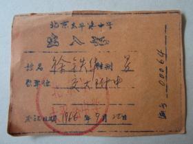 1966年北京市太平路中学出入证