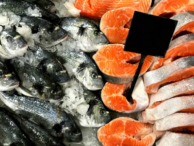 新鲜的三文鱼冰在市场上的牛排