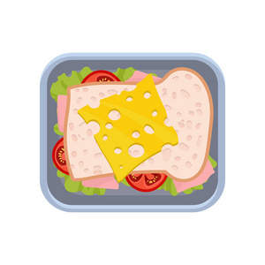 火腿 奶酪 新鲜的西红柿和生菜叶子在午餐盒。