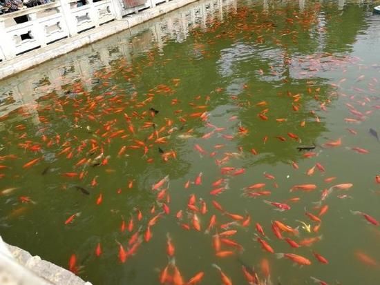 郑州碧沙岗公园游客狂撒鱼食 金鱼肚子撑到\
