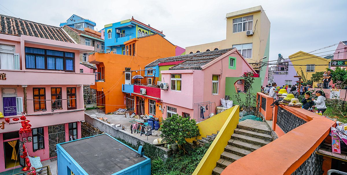 杭州一奇特渔村,建筑外墙颜色五彩斑斓,有\"