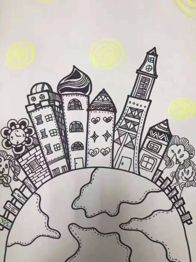 少儿美术:地球上的家园主题创意线描画,照着步骤一起学画画