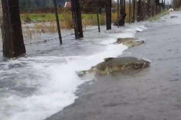 一场暴雨过后,大鱼都冲到了马路上,村民