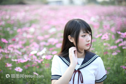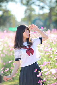 穿着粉红宇宙花的日本女学生制服的日本女