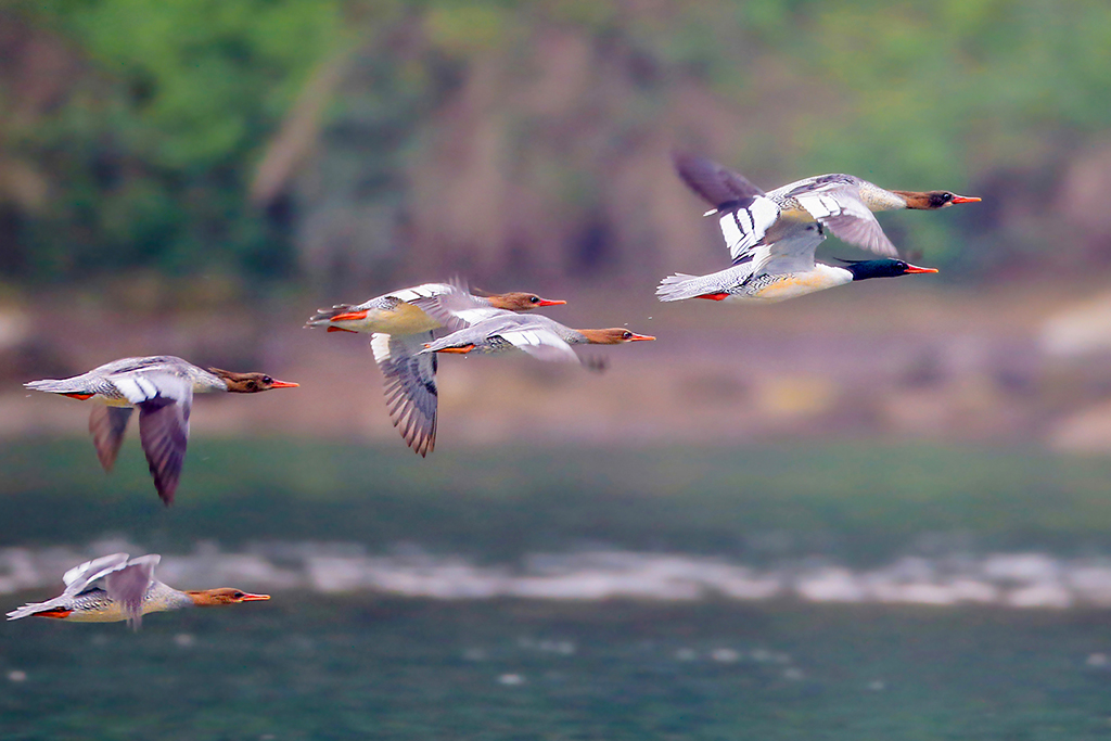 中国特产稀有鸟类中华秋沙鸭飞抵江西修河越冬