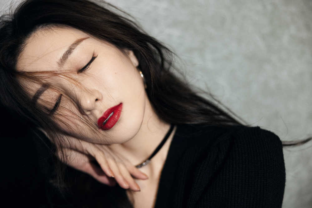 江疏影黑衣红唇媚眼如丝 秀发飞舞风情撩人