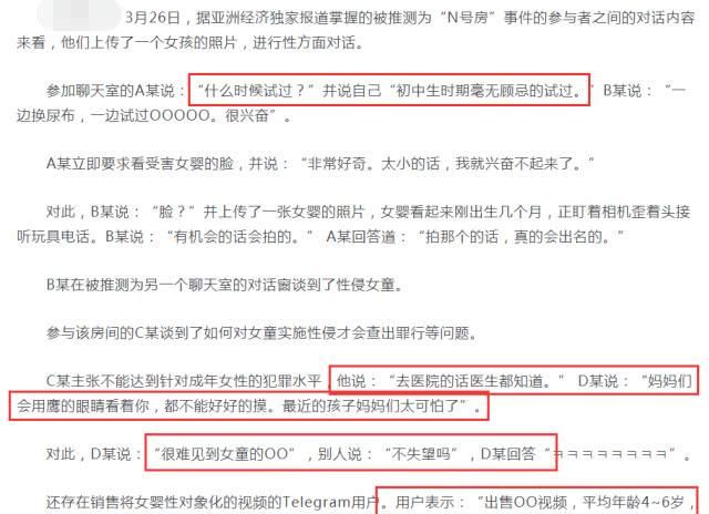3年26日,根据韩国媒体对“n号房间”事件的独家报道,聊天室成员之间的对话流了出来。这些话太露骨了,让人难以忍受。太恶心了。事实上,里面的人没有底线,让人怀疑这些付费会员是人性中的严重缺陷。