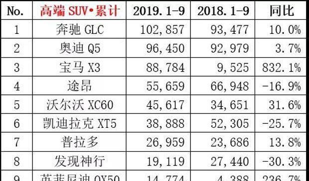 [2019年9月10大豪华SUV销量]最近,9月份最新汽车数据发布随着传统的“金九银十”在汽车市场的到来,销量比8月份明显回暖。9月份,国内狭义汽车销量为178.1万辆,同比增长14%,同比下降6.5%。今年1月至9月,累计销量为1478.2万辆,同比下降8.6%。当年底到来时,汽车市场将比今年上半年“更热”,这是毫无疑问的。就SUV车型而言,今年9月售出89万辆,同比增长0.6%。与汽车销量下降11.2%相比,销量要强劲得多,仅略低于5万多辆汽车,这意味着SUV与汽车的比例接近1:1。因此,目前SUV的受欢迎程度仍然相对较高。