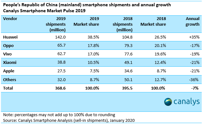 虽然整体市场表现很差,但华为是个例外在中国市场,华为的智能手机在2019年取得了惊人的成绩,全年出货量达到1.42亿部。华为也是唯一一个在中国市场销售的智能手机品牌,年销售额达1亿部。最终,华为的出货量实现了惊人的35%的同比增长,市场份额达到38.5%,比2018年增长了12%。