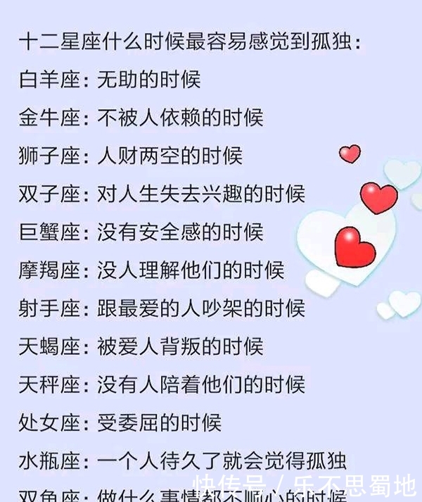 什么时候最容易感到孤独:白羊座:无助,金牛座:独立,狮子座:经济上空虚,双子座:对生活失去兴趣,巨蟹座:缺乏安全感,摩羯座:当没有人理解他们时,射手座:当和你最喜欢的人吵架时,天蝎座:当被你的爱人背叛时,天秤座:当没有人和他们在一起时,处女座:当受委屈时,水瓶座:当一个人待久了,一个白羊座:永远对你温柔,金牛座:永远给你小礼物,狮子座:永远来找你,双子座:扔掉你周围的花和植物,射手座:告诉你你在想什么,巨蟹座:关心你,照顾你,摩羯座:日夜呼唤你去关心和关心,天蝎座:永远在你面前微笑,处女座:温柔地看着你的眼睛,天秤座:礼貌地对你说话,水瓶:为你留在某个地方