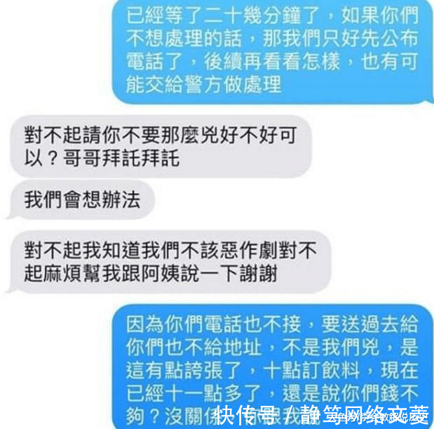 经理在晚上10:47骑自行车到指定地点,但他还没有看到任何人。经理很无奈,用手机联系了对方。这时,对方说他身上没有足够的钱,但这只是一个恶作剧,并恳求商店不要调查。从对话图表中可以看出,商店经理当时说可能会把它交给警方。他没想到对方听到这话会马上求饶:对不起,请不要这么凶,好吗,兄弟,请,请我没点,他们点了,但他们不想喝。< p>
