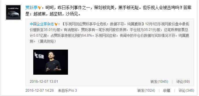 贾跃亭回应股权质押平仓线:黑手够无耻 沙场见