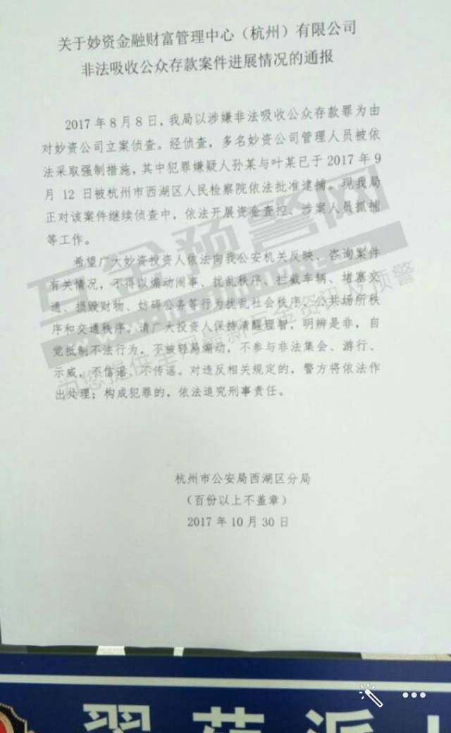 妙资金融最新动态,10月30日,杭州公安局案件侦