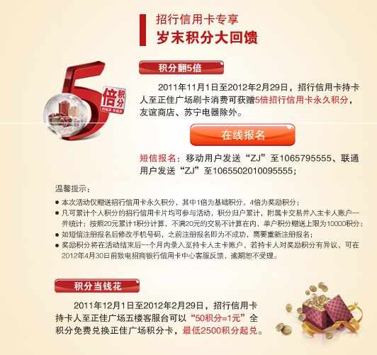 招行信用卡岁末回馈 刷卡送5倍永久积分