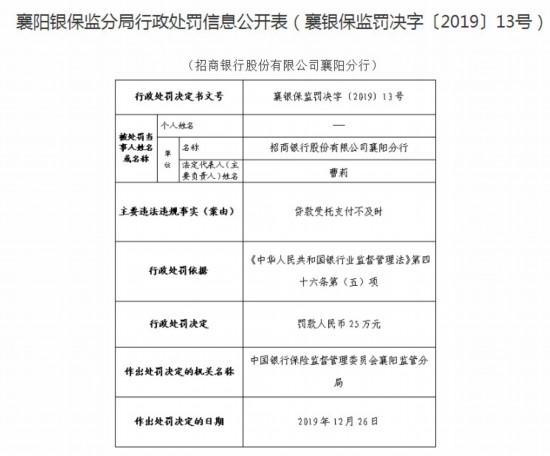 招商银行襄阳分行因贷款受托支付不及时遭罚2