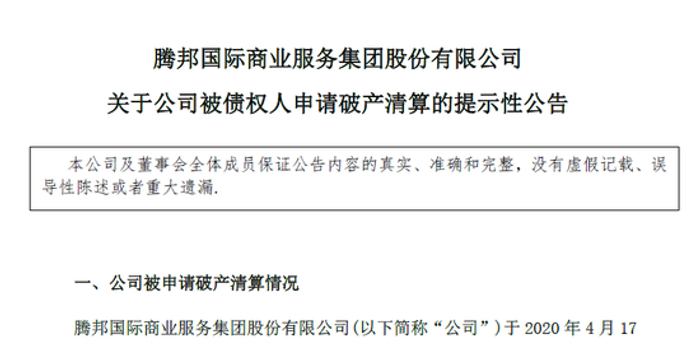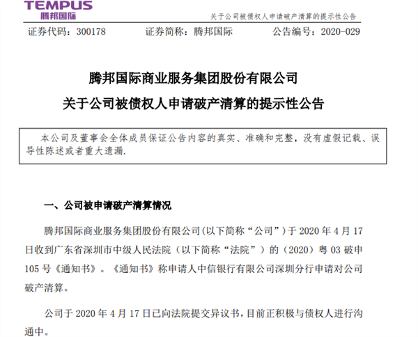 突发!上市公司腾邦国际遭银行申请破产清算,发